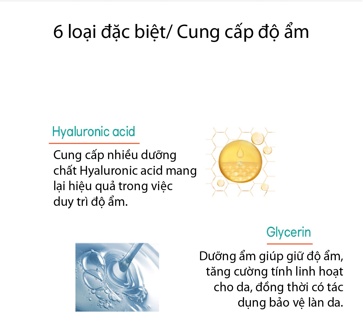 - Chứa 6 thành phần dưỡng chất đặc biệt giúp cung cấp độ ẩm rất cao như: Hyaluronic Acid - Giúp duy trì độ ẩm; Glycerin - Giúp dưỡng ẩm, tăng cường tính linh hoạt cho da, đồng thời có tác dụng bảo vệ làn da; Fish Collagen - Giúp bảo vệ da, ngăn ngừa lão hóa, vết nhăn, cung cấp độ ẩm; Menthyl Lactate - Tạo hương thơm tự nhiên, dễ chịu, giảm kích ứng nhiệt, mang lại cảm giác mát lạnh; Autumn Squash - Với thành phần tự nhiên từ thực vật, chứa nhiều Vitamin A, giúp tăng cường độ đàn hồi và ngăn ngừa lão hóa; A Castor Oil Plant - Dầu tự nhiên được chiết xuất từ loại hạt, giúp cải thiện làn da khô, chứa nhiều thành phần chống Oxy hóa giúp làn da được khỏe mạnh hơn