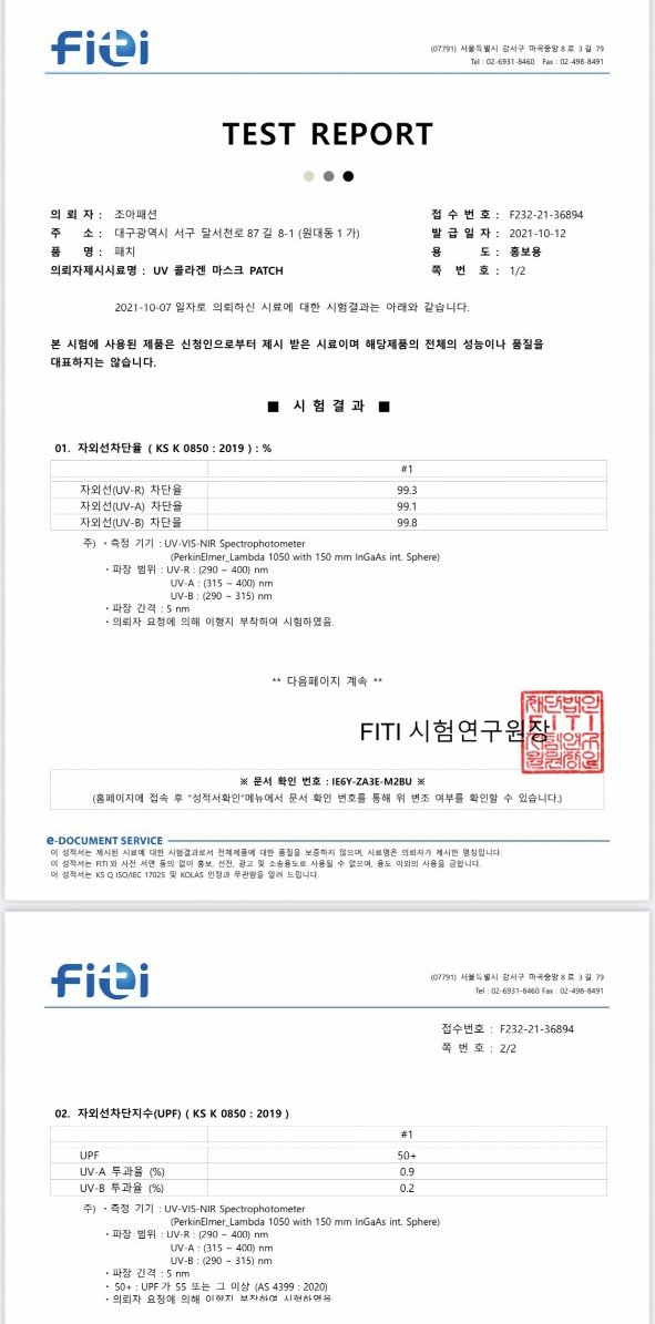 Miếng dán Hustony Cooling Collagen chống tia UV đã được kiểm chứng về chất lượng sản phẩm tại cơ quan thử nghiệm của Hàn Quốc với khả năng chống tia UV cao lên tới 98,9%, giúp người dung an tâm sử dụng ngay cả khi hoạt động ngoài trời.