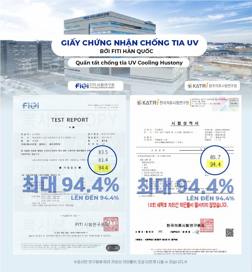 - Quần tất chống nắng Hustony Cooling 80D được cấp Giấy chứng nhận chống nắng bởi các Viện nghiên cứu hàng đầu tại Hàn Quốc: FITI và KATRI với khả năng chống nắng cao tới 94.4%